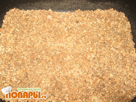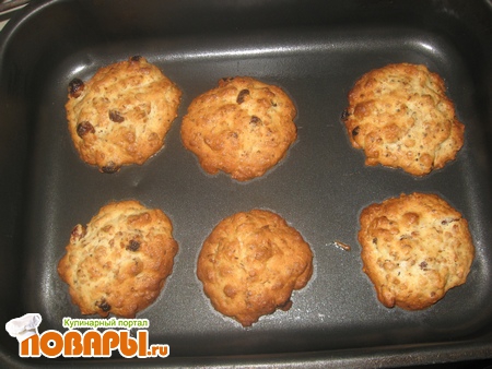 Ввести овсяные хлопья, разрыхлитель, муку и изюм и замесить тесто. По консистенции оно будет похоже на жирную сметану, но со временем станет более плотным, так как хлопья разбухнут. Печенье формируем чайной ложкой, расправляя, если нужно, мокрыми пальцами. Красивых форм особо не получить, так как в составе есть изюм. Главное, делать печенье не толстым - не более 5мм толщиной.