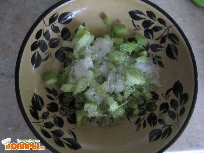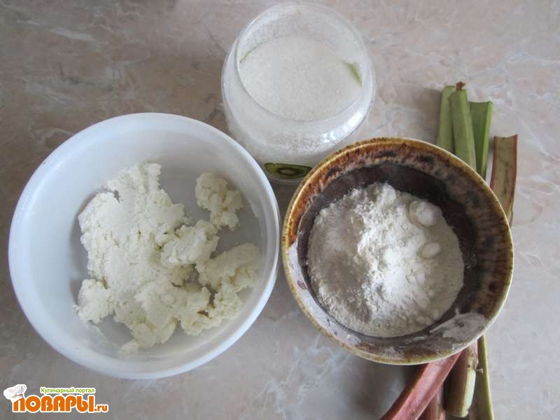 Дальше берем черешки ревеня, чистим и мелько нарезаем, засыпаем сахаром и тоже отставляем на пол часа, чтобы пустился сок. Когда ревень станет более мягким, процеживаем сок и наша начинка для печенья готова.