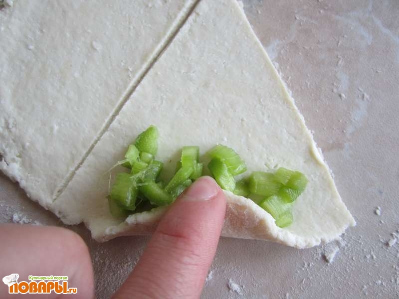 Дальше вынимаем тесто из холодильника и раскатываем. Потом разрезаем на кусочки.