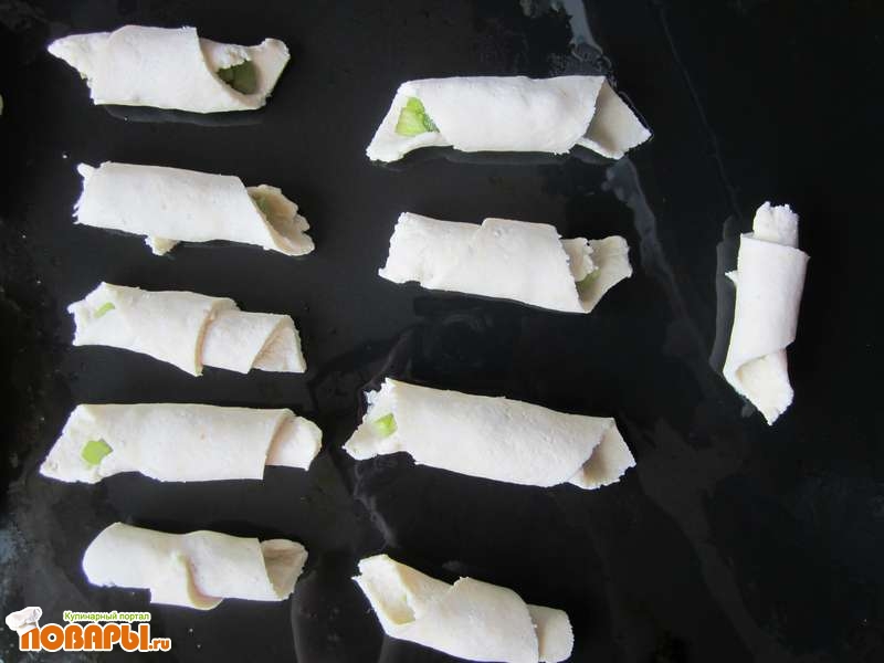 Дальше берем противень и смазываем его подсолнечным маслом и выкладываем на него наши трубочки.