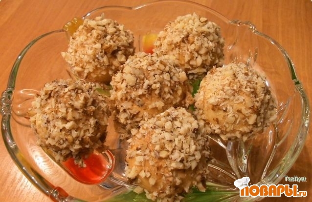 Печенье окунуть в тёплый мёд. Затем обвалять в орехах.