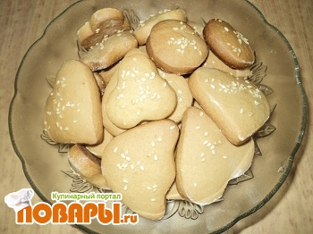 Раскатываем его, на посыпанном мукой, столе (толщиной около 0,5 см). Вырезаем кружочки стаканом или разные фигурки формочками. Выкладываем фигурки на смазанный маслом противень, слегка смачиваем верх водой и посыпаем сахаром (я еще посыпала кунжутом, думаю много чем можно - все зависит от ваших пристрастий).