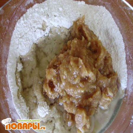 В чашке смешать финиковое пюре, сухую смесь и масло.