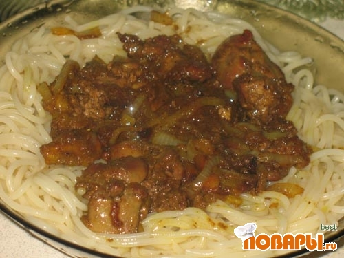 Добавить печень и лук в соус и ещё проварить около 5 минут.