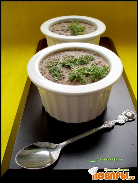 Добавить процеженный бульон ( где-то стакан и больше) и кусочки масла. Поставить на огонь и довести до кипения. Разлить по формочкам.