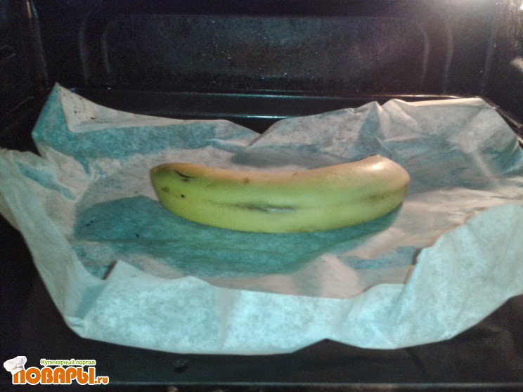 Через стеклянную дверцу духовки наблюдаю за процессом - как только банан шкурка банана потемнеет и лопнет - блюдо готово.