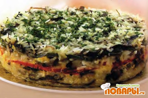 Разъемную форму смажьте маслом, выложите в несколько слоев рисовую массу и перец. Каждый слой полейте яйцами, взбитыми со сметаной. Запекайте в духовке 20 минут.