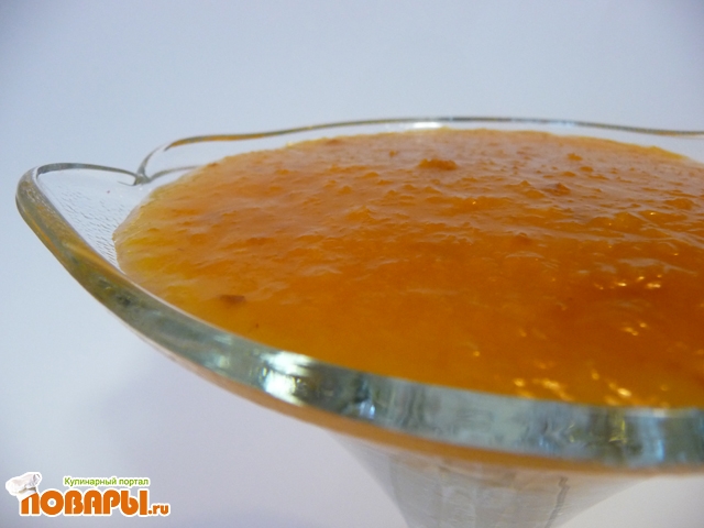 Персиковое пюре доводим снова до кипения, добавляем разведенный в воде крахмал, перемешиваем, снова доводим до кипения и снимаем с огня.