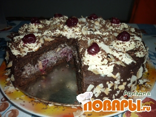Забыла написать, что вишня используется без косточек. А "Пьяная вишня" внешне похож на "Черный лес", но по приготовлению - они разные. В "Черном лесе" крем - взбитые сливки, и вишня - не вымачивается в коньяке, идет или сежая, или консервированная, из компота.