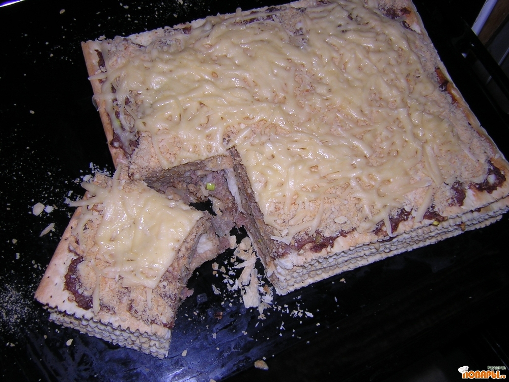 Корж покрыть ровным слоем фарша, затем опять корж и снова фарш и т.д.