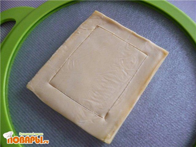 Тесто разморозить. Положить на противень. На каждом куске теста ножом очертить контур внутреннего прямоугольника, отступир от края 1,5 см.