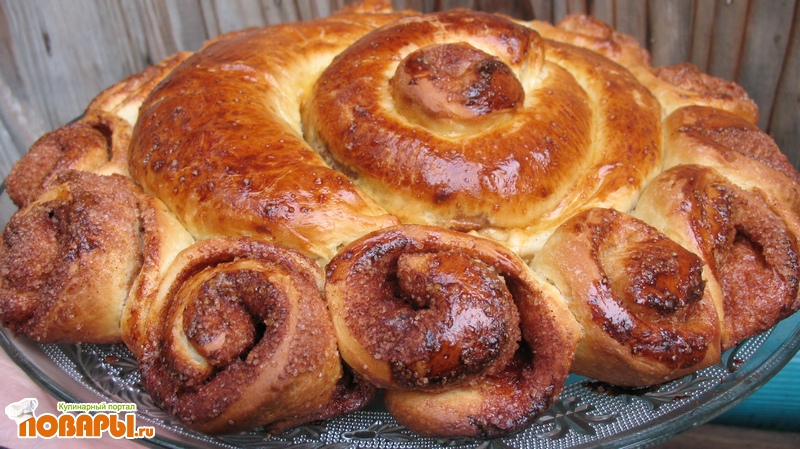 Замесите дрожжевое тесто. Оставьте на час в тепле. Из готового теста сделайте рулеты - начинка сахар, смешанный с корицей. Получается 3-4 рулета. Один из рулетов сверните спиралью или улиткой и выложите на противень.