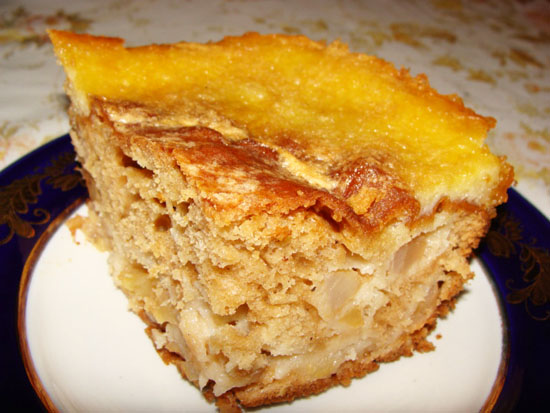 На дно формы выкладываем яблоки. Форма предварительно смазана жиром! На яблоки выливаем тесто и выпекаем до готовности,