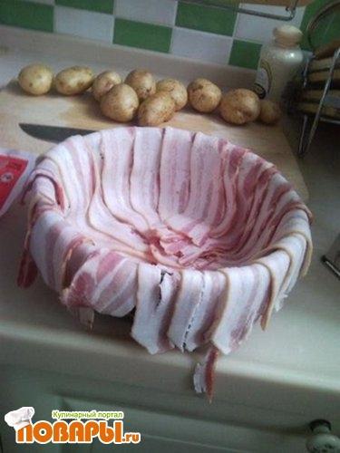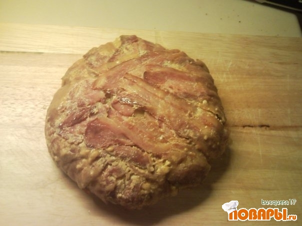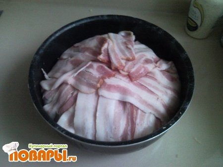 Красиво заворачиваем свисающие кончики бекона и отправляем в разогретую до 200 градусов духовку на 50-60 минут.