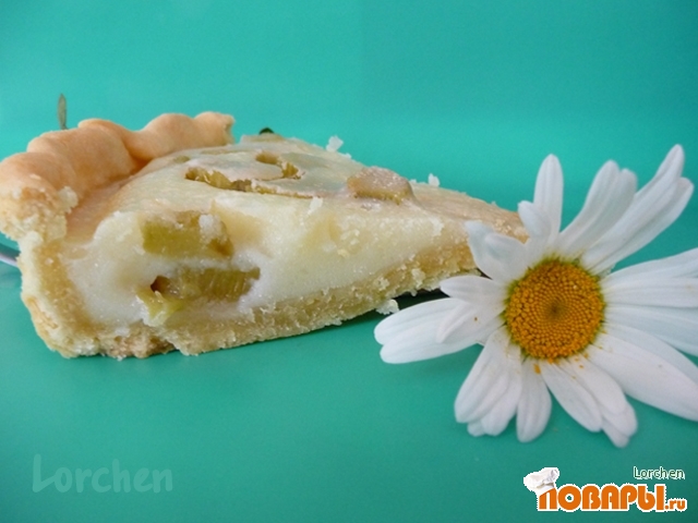 На тесто выкладываем дольки ревеня (без сока) и заливаем заливкой.