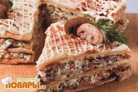 На блюдо уложите один корж, выложите на него половину горячей начинки, накройте вторым коржом, уложите оставшуюся начинку и накройте третьим коржом. Пирог посыпьте паприкой и оформите зеленью и майонезом. Сразу подавайте.