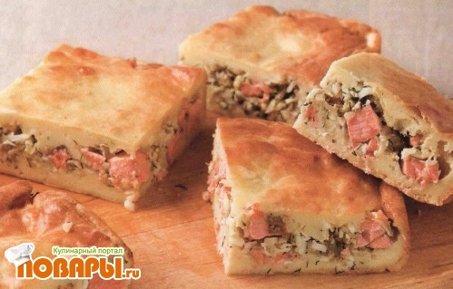 В форму, смазанную маслом, выложите 2/3 теста, затем начинку, сверху - оставшееся тесто.