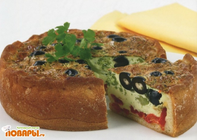 Брокколи варите на пару 3 минуты. На основу для пирога уложите перец, брокколи, маслины и залейте сливками, взбитыми с сыром, петрушкой, солью и перцем. Выпекайте пирог при 220 °С.