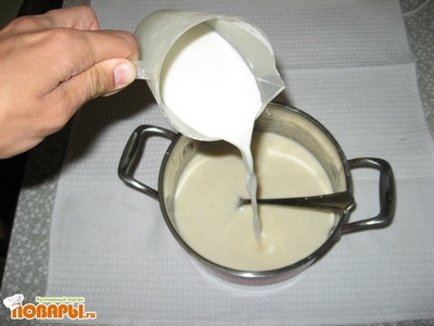 Добавляем растопленное и охлажденное сливочное масло. Всё тщательно перемешиваем и вливаем в эту смесь молоко.