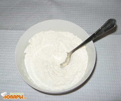В отдельной миске перемешиваем муку и разрыхлитель. Всыпаем полученную смесь в кастрюльку с тестом, перемешиваем аккуратно ложкой, а потом взбиваем миксером минуты две.