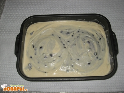 Сверху выливаем тесто. Слегка ложкой перемешиваем ягоды с тестом, выполняя движения сверху вниз, как-бы подкручивая тесто. Эти действия нужно выполнить очень аккуратно, так как черника ягодка нежная, быстро может дать сок.