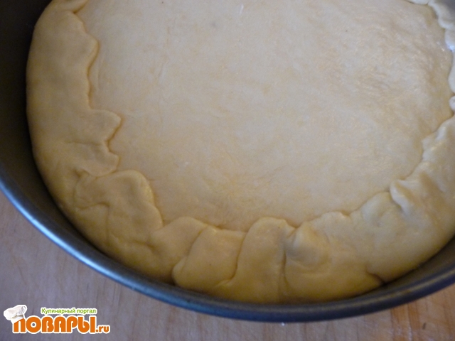 Раскатать одну часть теста по размеру формы. Положить поверх начинки.