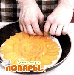 Нарезанные персики плотно уложить на поверхность будущего пирога так, чтобы одна долька перекрывала другую.