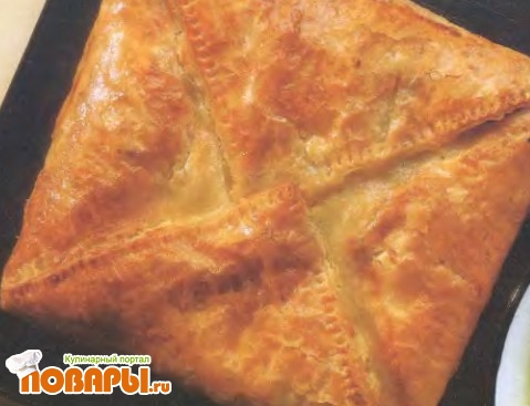 Края теста слегка смазать холодной водой и сложить конвертом. Прижать швы вилкой и смазать верх пирога взбитым яйцом.
