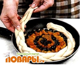 Смазать края нижнего пласта яйцом и уложить по окружности приготовленную косу, хорошо скрепив ее концы, смазать взбитым яйцом. Поставить пирог в теплое место на 20 минут.