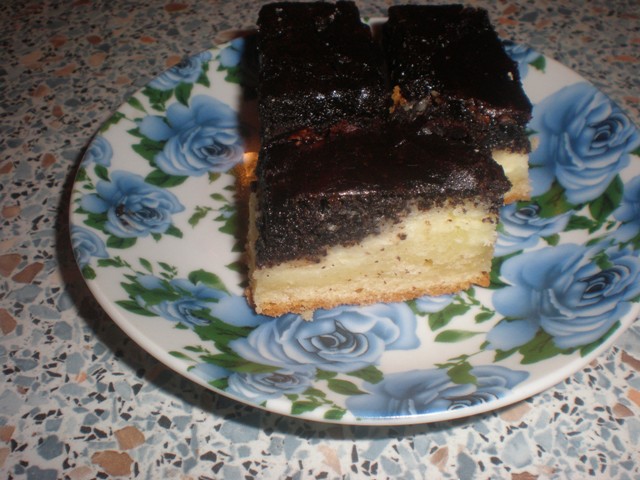Тесто присыпать манкой, выложить творожную массу, разровнять, потом - маковую. Испечь при t 1750. Остывший пирог можно залить сверху растопленным шоколадом или шоколадной глазурью.