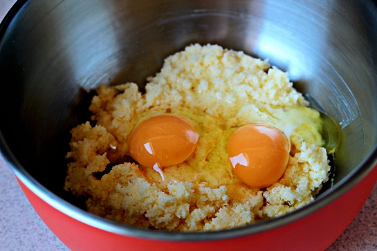 Просеиваем и перемешиваем в миске муку, разрыхлитель, соду и добавляем соль. В другой емкости взбиваем масло с 200 г сахара. Затем добавляем ванильный экстракт и яйца.