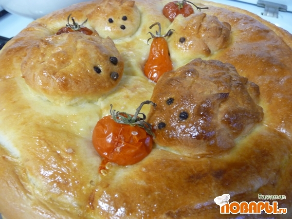 Делим тесто на 2 части. Одну часть раскатываем кругом, укладывам в форму, затем начинку, и сверху закрываем второй раскатоной частью теста. Защипляем края. Украшаем (а можно и без украшения) - мы вот с дочкой ежиков (ну или что-то подобное ))) сделали. И в духовку, разжаренную до 200 градусов!!!