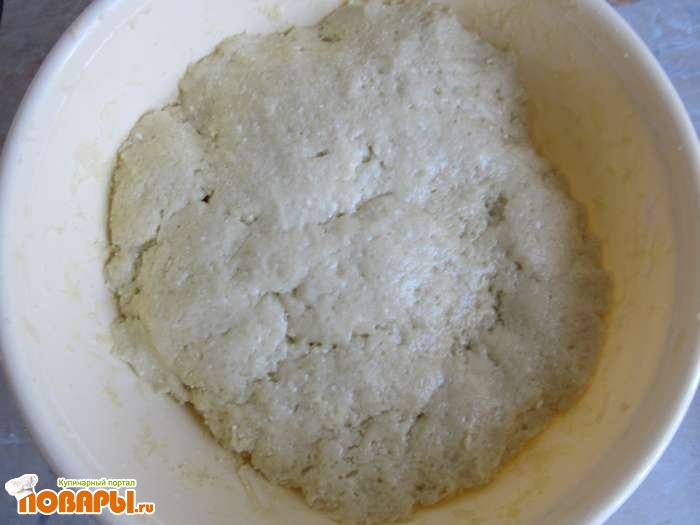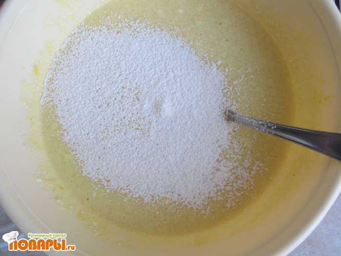 Все хорошо перемешиваем и добавляем предварительно просеяную пшеничную муку. Опять тщательно все перемешиваем.