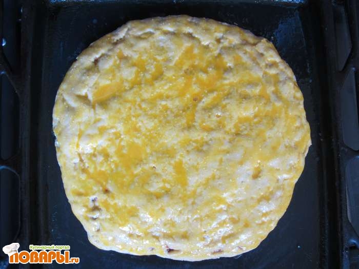 Сверху накрываем другой половинкой теста и соединяем края. Поверхность пирога смазываем взбитым желтком.
