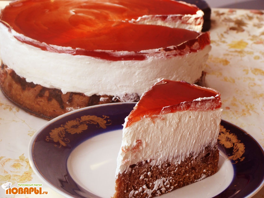 Отдельно взбить сливки до твердых пиков и смешать с творожной массой, добавить ваниль. Выложить массу на выпеченный корж и отправить пирог в холодильник на пару часов для застывания.