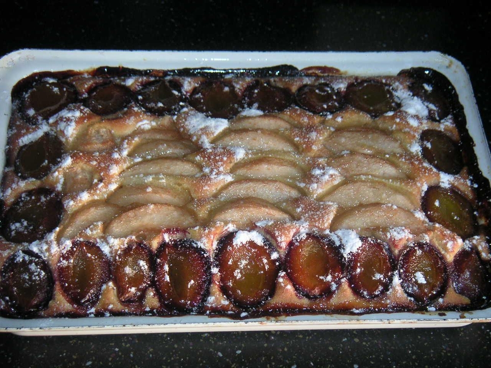 Сливы вдавить в тесто по краям и по середине. Остальное пространство заполнить кусочками груши.
