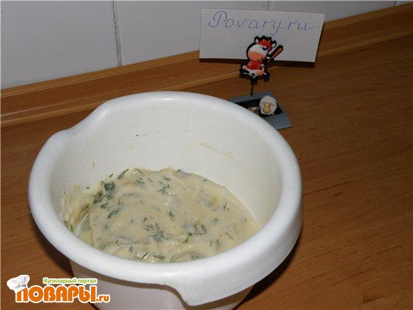 Выкладываем тесто, пусть размораживается. Отвариваем очищенную картошку и обязательно солим. Пока она варится, взбиваем до крепкой пены белки 2-х яиц. Из картофеля делаем пюре с добавлением небольшого количества масла и порезанного укропа, а затем аккуратно вводим взбитые белки.