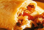 Выложите на середину 2 ст. ложки начинки, сложите круг пополам, защипите края и выложите на смазанный маргарином противень. Сверху смажьте чуть взбитым яйцом. Выпекайте в разогретой до 180°С духовке.