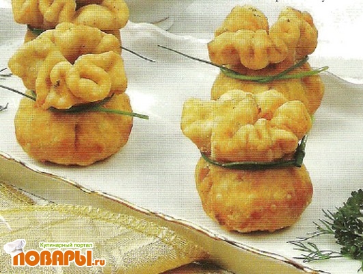 Разложите начинку на лепешки, соберите края сверху, придавая форму мешочка, сдавите пальцами. Жарьте во фритюре. Обсушите на бумажной салфетке для удаления излишков масла.
