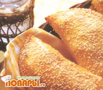 Смазать пирожки оставшимися взбитыми яйцами и посыпать кунжутными семенами. Выпекать в центре духовки 20 минут, пока тесто не покроется золотистой корочкой. Остудить на решетке или упаковать для пикника, украсить и подавать на стол с зеленым салатом и белым хлебом.