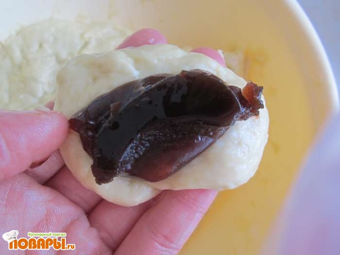 Дальше постепенно добавляем муку. Все хорошенько смешиваем и делаем густое тесто. Тесто необходимо отставить пару раз на некоторое время, чтобы оно подошло. Когда тесто будет готово, можно лепить пирожки: отрываем немного теста, делаем лепешку, в серединку добавляем ложку повидла.