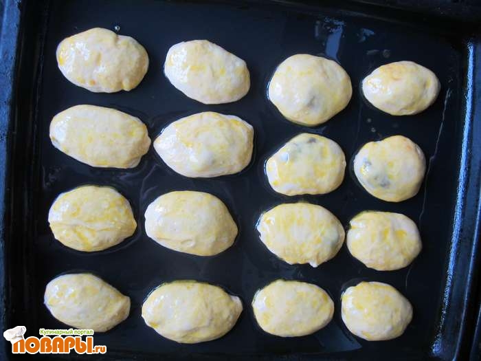 Пирожи выкладываем на смазанный растительным маслом противень и сверху намазываем взбитым яичным желтком.
