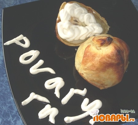 Тесто раскатать в тонкий пласт и завернуть в него уже пропитавшиеся груши. Оставшимся медовым соусом смазать тесто для получения золотистой корочки. Запекать в духовке 20-30 мин.