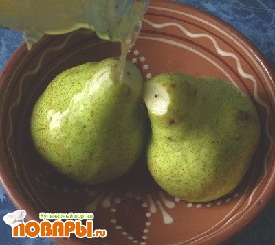 Груши проколоть много раз зубочисткой. Мед смешать с коньяком (если мед густой, то растопить его на водяной бане и добавить немного воды). Залить алкогольно-медовым соусом груши и настоять 30 мин.
