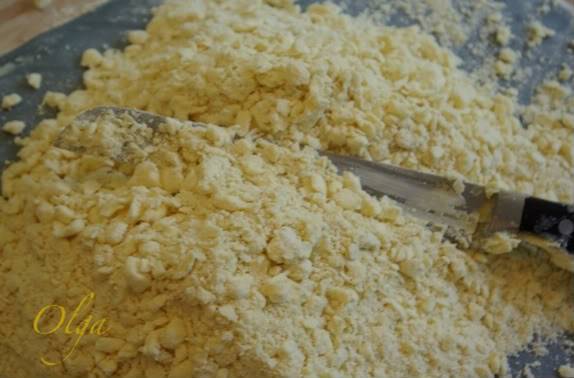 Муку высыпать на стол, смешать с кусочкми маргарина, порубить ножом, помять руками до получения мелкой крупки. Развести соль в холодной воде и влить с лимонной кислотой или укусом в рубленую массу. Замесить тесто.
