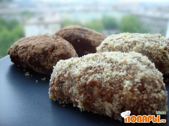 Обвалять пирожные в измельченных грецких орехов. (или в кокосовой стружке, или в смеси из какао с сахарной пудрой).