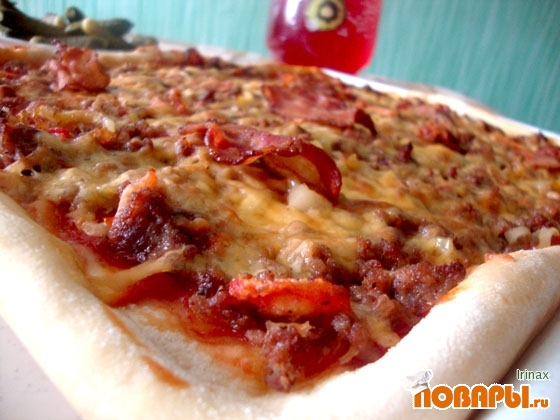 На масле обжарить бекон,буквально чуть-чуть. Выложить бекон на готовую пиццу.