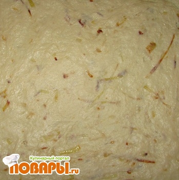 После чего в подошедшее тесто вмешиваем обжаренный лук с маслом, на котором он жарился и еще раз даём тесту подойти.