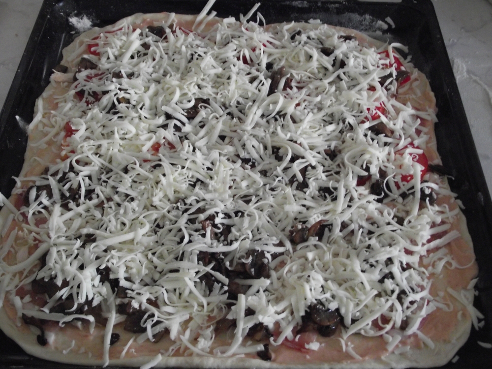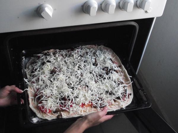 Начинка для пиццы может быть самой разнообразной, на ваш вкус. Лично я предпочитаю что бы начинка состояла из бекона, отварной курицы, жаренных грибов с луком,помидоров и конечно же сыра.