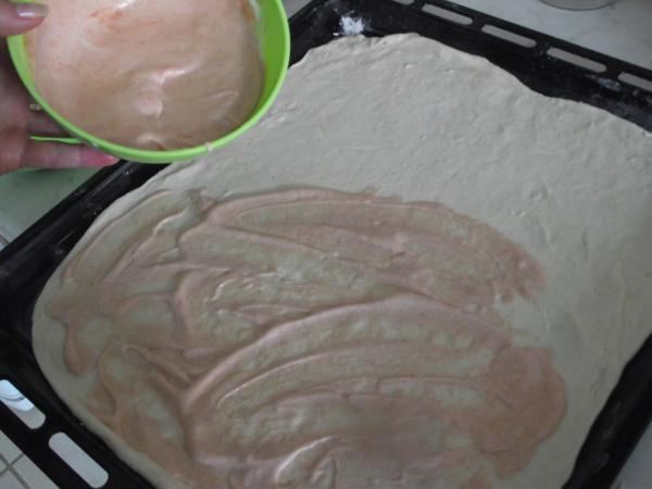 После того как вы расскатали тесто и поместили его на противень, смешайте три столовых ложки майонеза с одной ложкой кетчупа и смажьте тесто этой смесью.